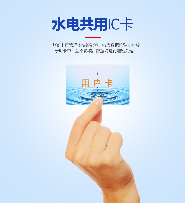 4.一卡通功能:若同一用戶安裝兩只以上水表或同時安裝我公司的水表、電表、燃氣表等,多只智能表可共用一張卡管理,使用方便。